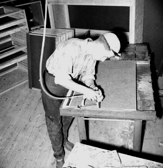 Carlsfors (Karlsfors) snickerifabrik, interiör, en man.