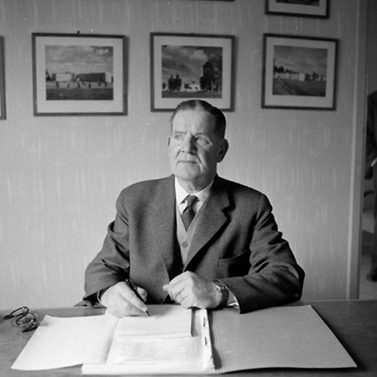 Titel: Kontorsinteriör, en man vid skrivbordet. Byggmästare Johan Andersson