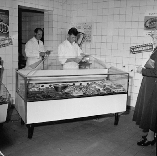 Konsum, affärsinteriör, köttdisk, två män och en kvinna.