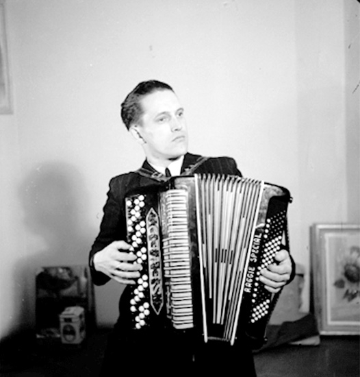 Titel: En man med musikinstrument (dragspel). Erik Seved Elis Granath, f. Larsson, Örebro (1913-1978).