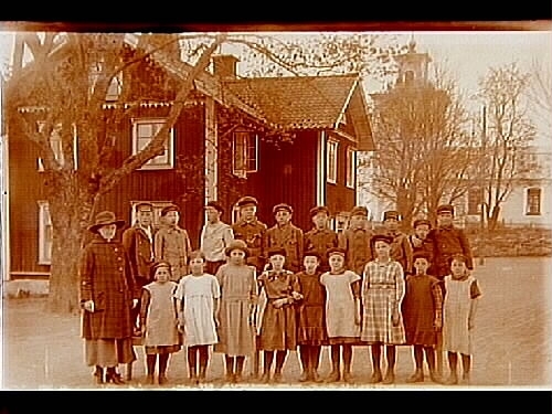 Tysslinge kyrkskola, tvåvånings vinkelbyggd skolbyggnad, 19 skolbarn med lärarinnan fröken Kristensson.