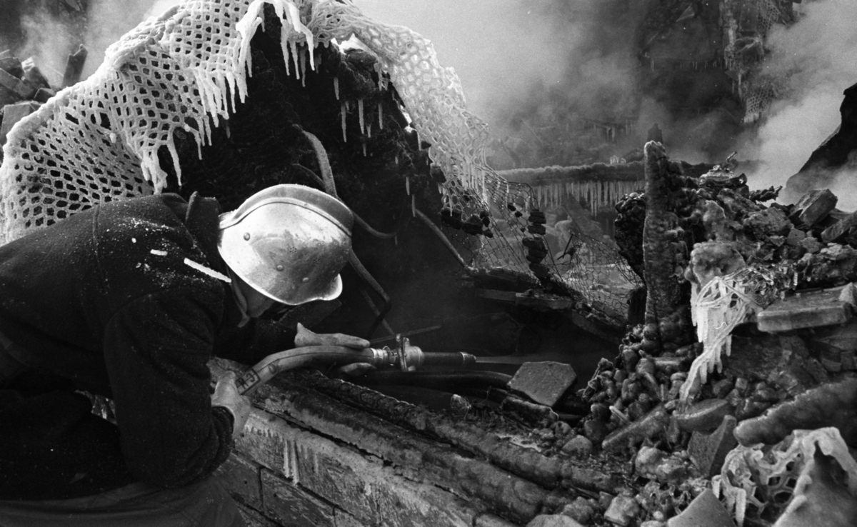 På bilden syns en brandman som böjer sig fram med brandsprutan i sina händer. Han riktar vattenstrålen in mot resterna av en utbränd skola i Nora. Istappar hänger från byggnaden. Det är rökutveckling.