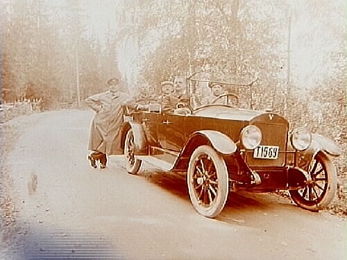 Fem män i en öppen automobil med Nr. T1569.