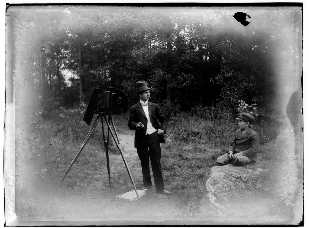 Fotograf Sam Lindskog med kameran och en liten pojke ute i skogen.