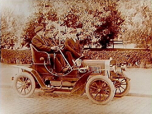 Titel: Örebros första övningsbil, automobil med två män i och en man utanför. Registreringsnr. T127. E. Wern (Troligen var det E. Wern, Storgatan 10, Örebro som beställde bilden)