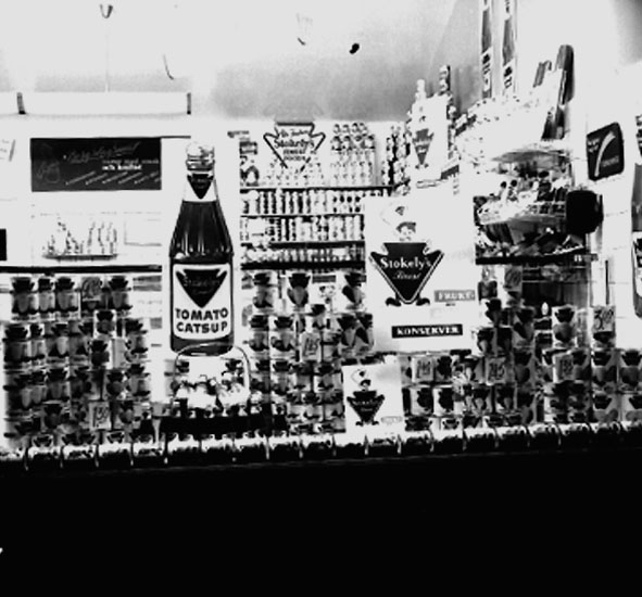 Gustafsons, affärsexteriör, skyltfönster med Stokely's finest frukt- och juicekonserver.