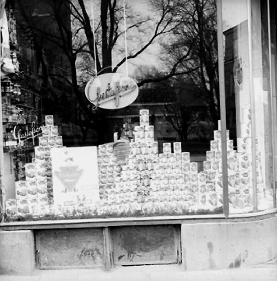 Gustafsons, affärsexteriör, skyltfönster med Stokely's finest frukt- och juicekonserver.