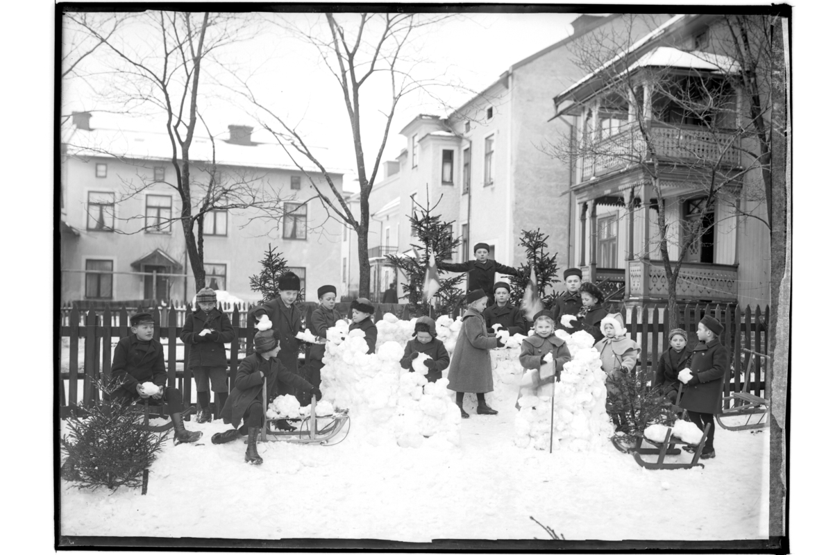Tre hyreshus, 16 lekande barn, snögrotta.