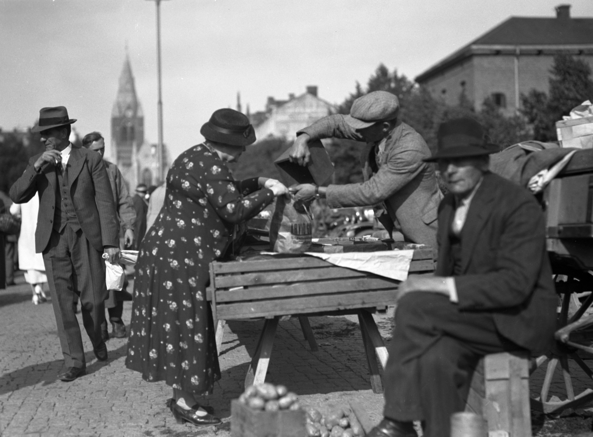 Torghandel på Stortorget, torgstånd med handlare och kunder.