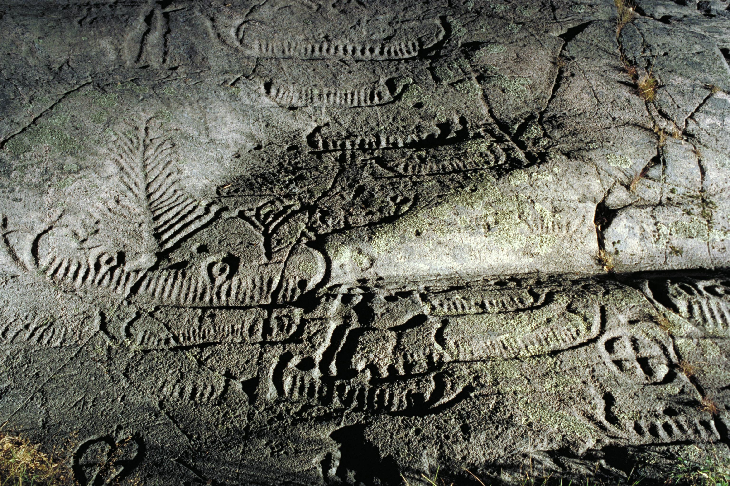Skepp, människofigur och gran- eller ormbunkes-liknande trädfigur.