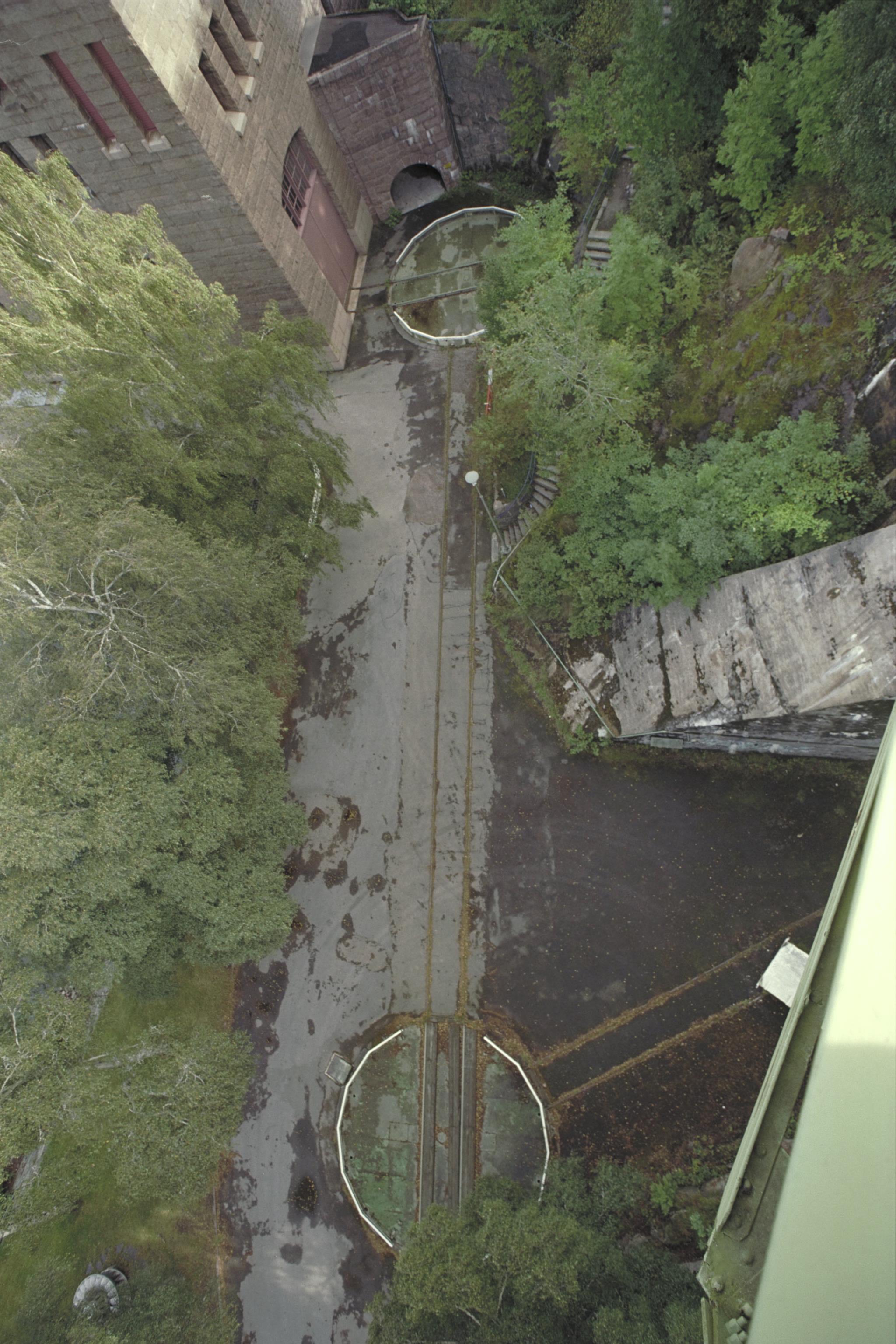 De två vändskivorna som hjälper vagnarna fram till turbinhuset. Sett från ett uppifrån-perspektiv.