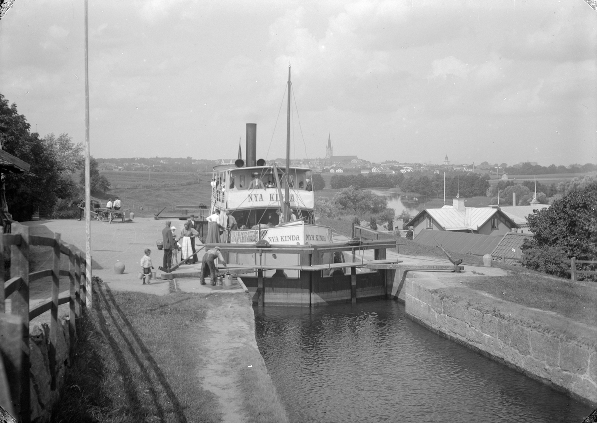 Passagerarfartyget Nya Kinda i Tannefors sluss för vidare färd söderut mot Horn. I fonden Linköping. Fartyget var byggt på Mälarvarvet 1896 och sattes i trafik mellan Linköping och Horn redan samma år. Hon kom att trafikera Kinda kanal till 1912, då hon flyttades till Torne älv genom köp av Ångbåts AB Seskarö i Haparanda.
