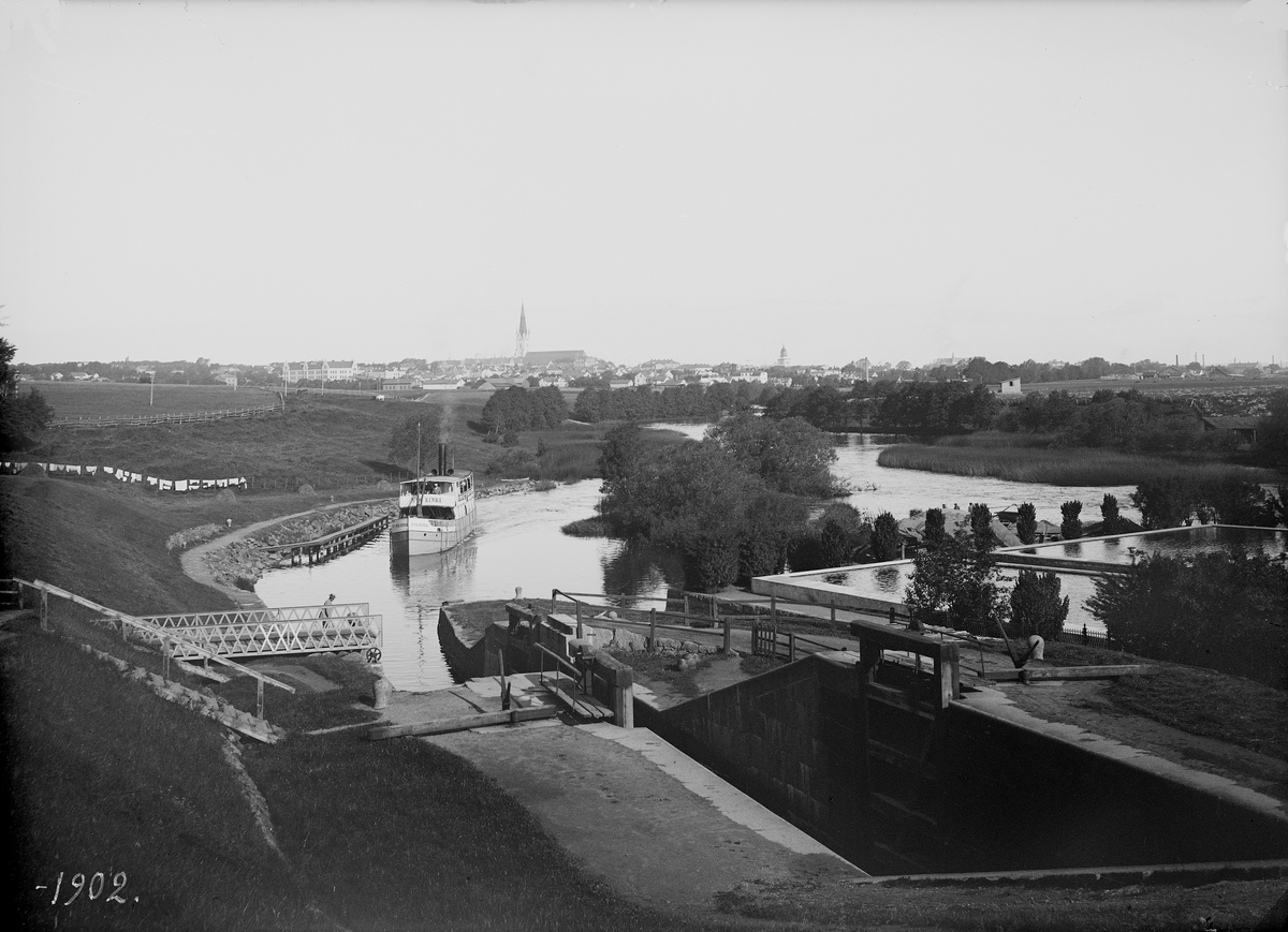 Vy från Tannefors sluss mot Linköping. Mot slussen stävar passagerarfartyget Nya Kinda.