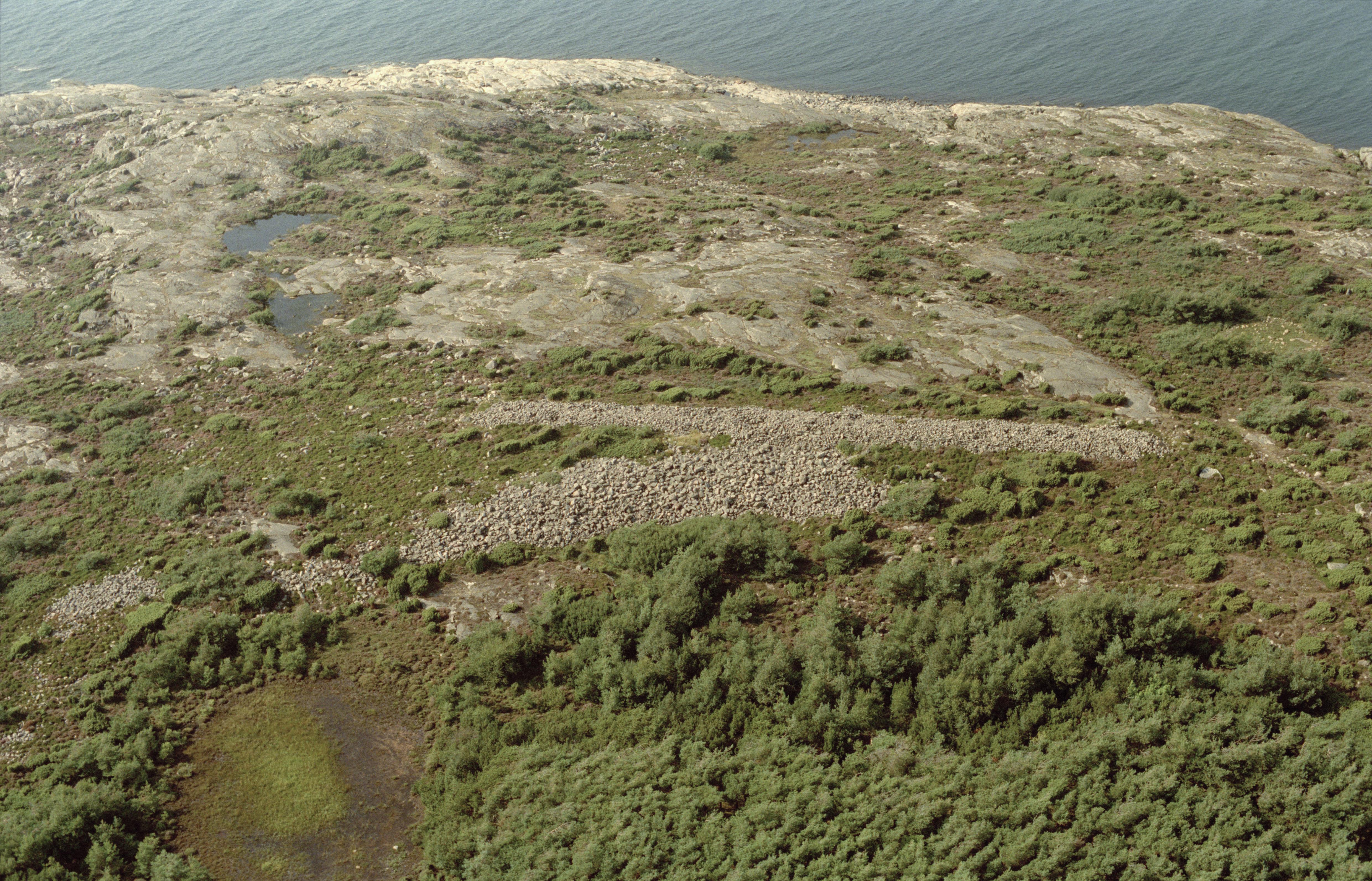 Norra delen av Onsala Sandö. Röse RAÄnr Onsala 82:1 i bildens mitt. Bilden är tagen mot (väderstreck): N