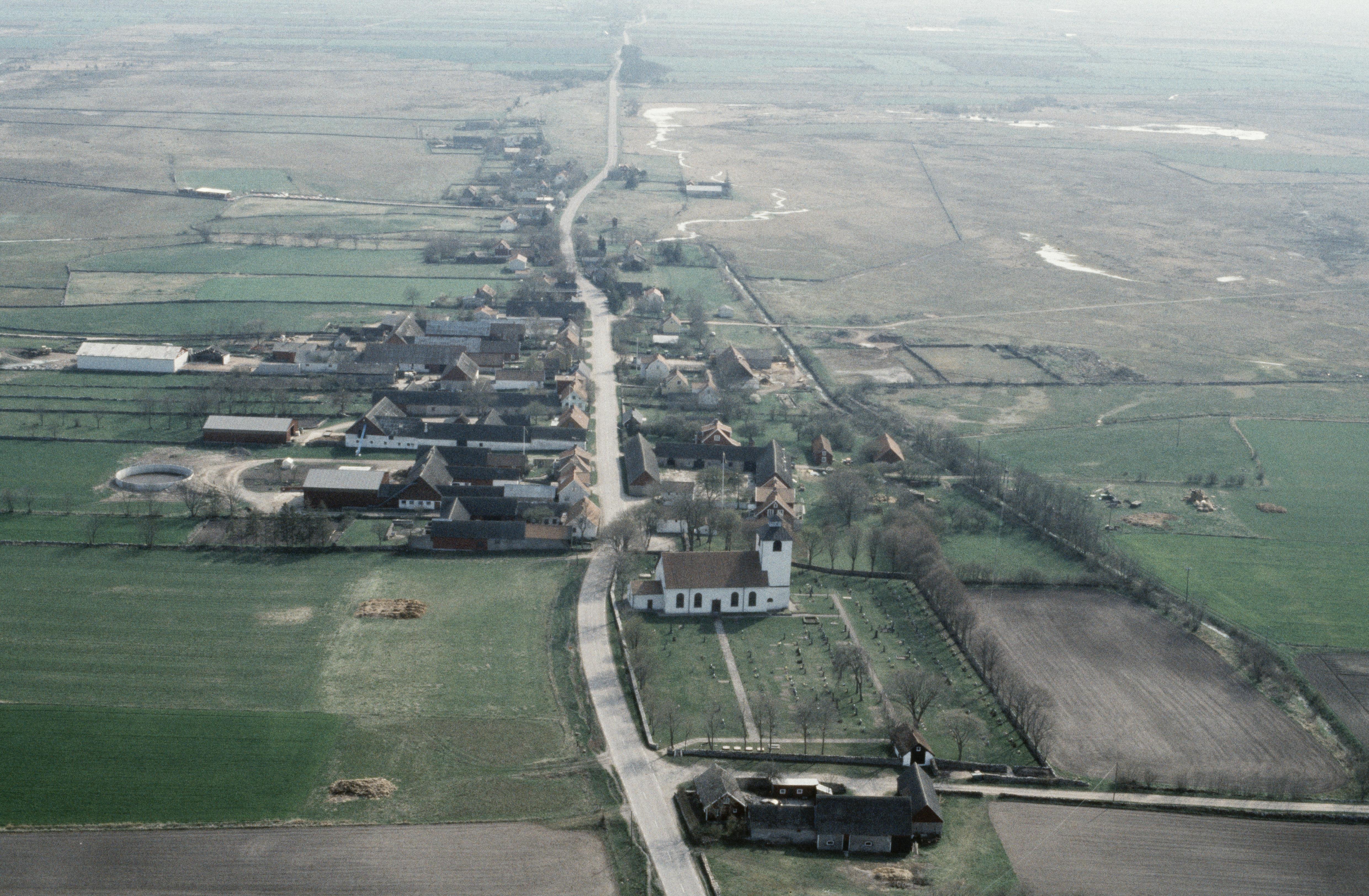 Alvaret. Hulterstads kyrka och kyrkby. Bilden är tagen mot (väderstreck): S