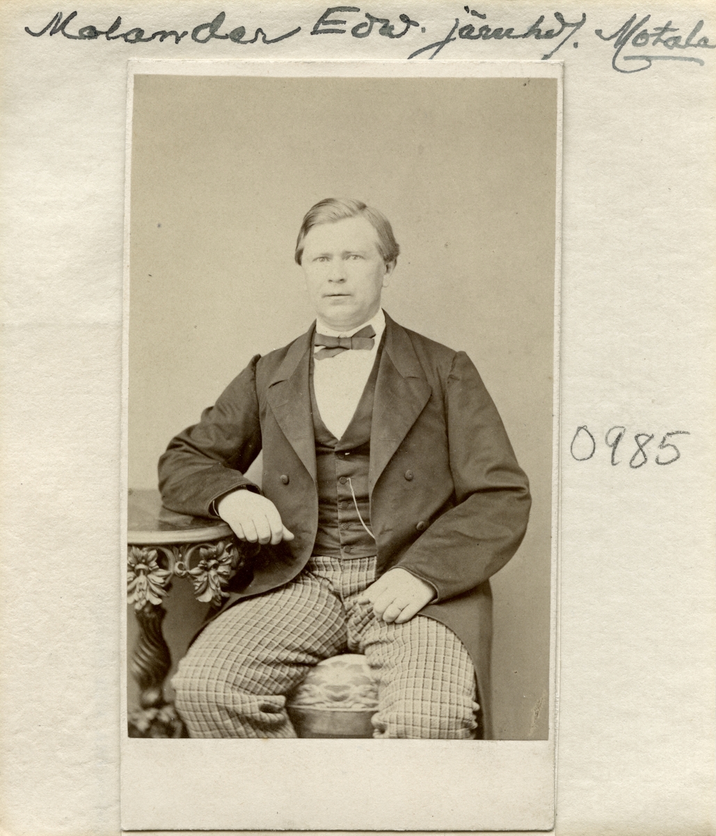 Porträtt av järnhandlare Edward Molander. Född i Västra Stenby 1824 som son till kronolänsman Eric Gustaf Molander och dennes maka Hedvig Blomberg. Redan under sitt födelseår flyttade familjen emellertid till Åtvidaberg där fadern erbjudits tjänst som inspektor vid baroniets lantbruk. I vuxen ålder inflyttade Molander till Linköping för att tjäna som bodbetjänt hos handlare Otto Gustaf Kjellman, i dennes butik invid Stora torget. Efter några år i lära etablerade han sig 1854 i Motala för att som egen driva järnhandel. Från 1861 var han gift med Regina Henrietta Carlsson.