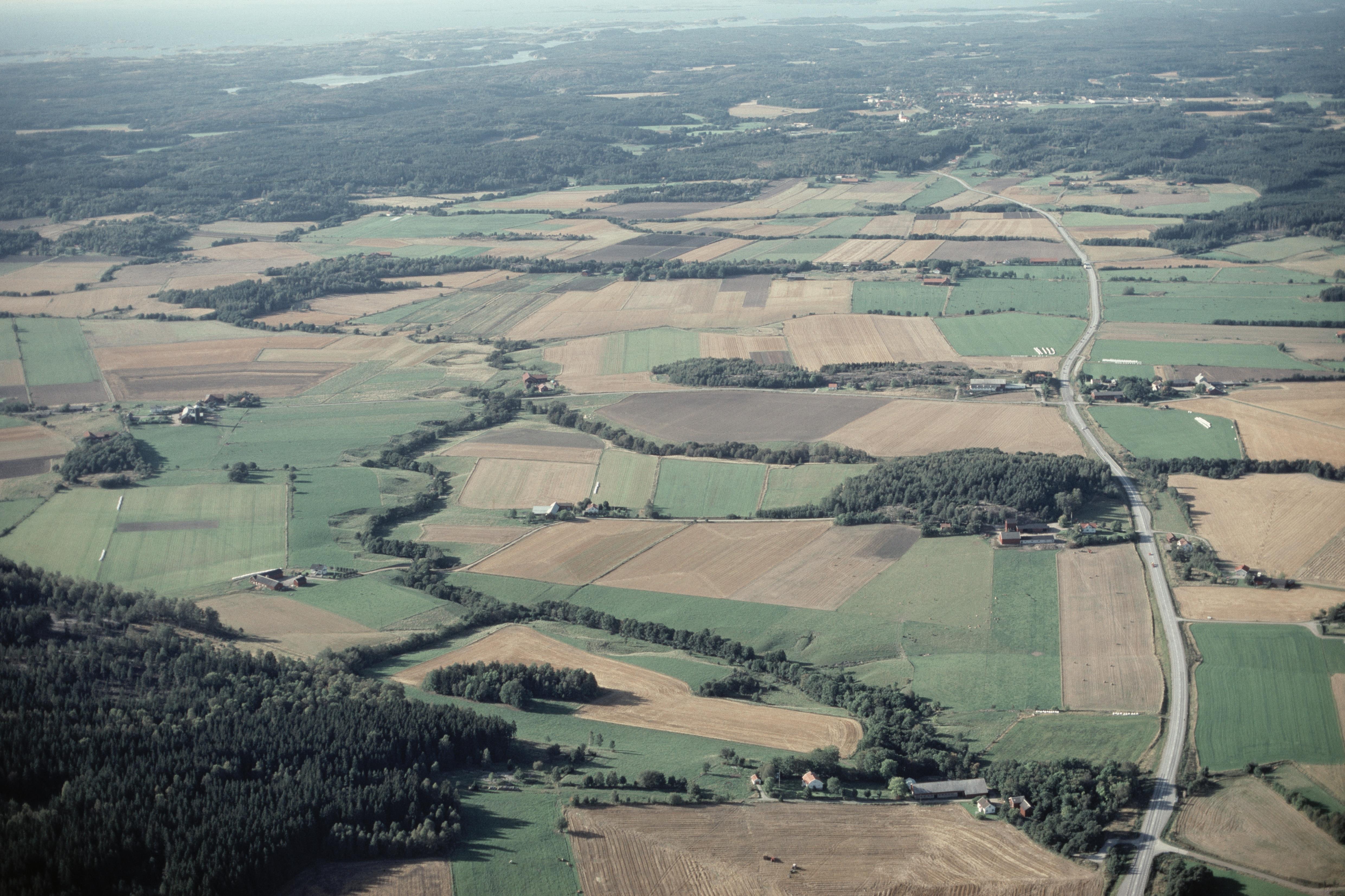 Tanumsslätten. Hällristningsområde i fornlämningsrik dalgångsbygd. Tegneby, Aspeberget, Kyrkoryk, Nedre Ljungby, Ljungbytorp, Gerum m.m. i bildens övre del. Boplats RAÄnr Tanum 1807:1 m.fl. vid bildens mitt. Bilden är tagen mot (väderstreck): NV