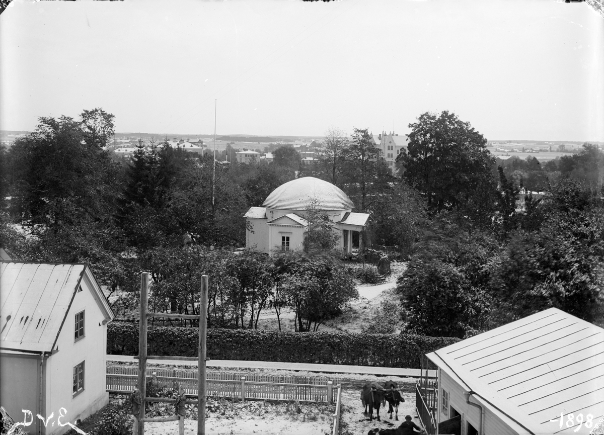 Vy mot Wallenbergska trädgården i Linköping. Lusthuset uppfördes på 1830-talet. Bilden tagen från området där fotografen hade sin ateljé vid tiden.