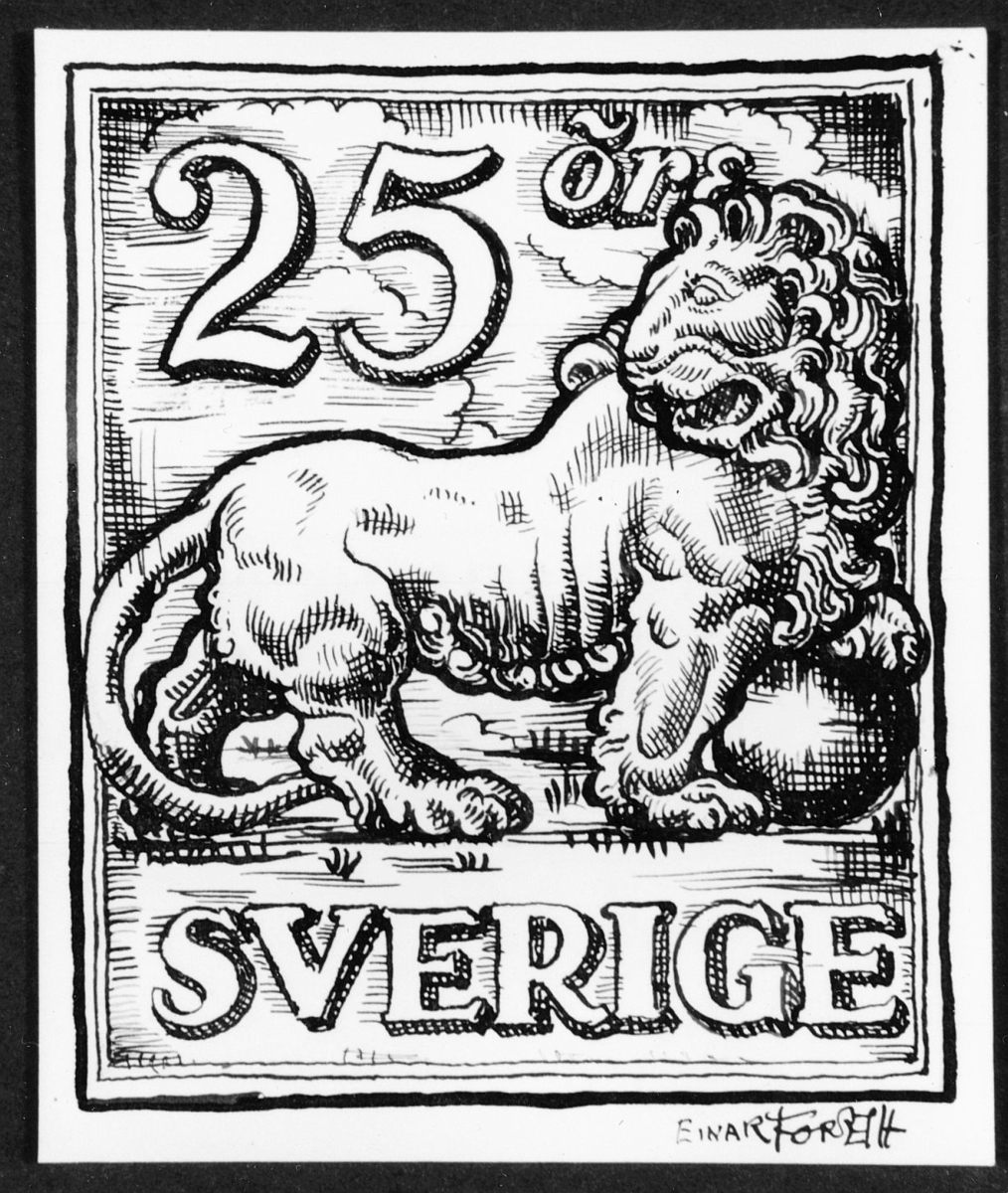 Förslagsskiss till frimäret "Stående Lejon" utgivet 1920 av Einar Forseth.