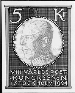Frimärksförlaga till frimärket VIII:e Världspostkongressen, utgivet 4/7 1924. I teckningen är infälld fotografisk reproduktion av det av Emil Österman tecknade porträttet för typ Gustaf V profil 1921. Valör 5 kr.