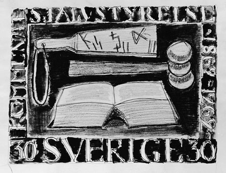 Frimärksförlaga till frimärket "Kommunallagarna 100 år", utgivet 21/3 1962. Budkavle, lagbok, ordförandeklubba. Förslagsteckningar utförda av Kerstin Abram-Nilsson. (I Postmusei samlingar). Förslag (3).
