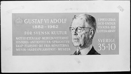 Frimärksförlaga till frimärket Gustaf VI Adolf 80 år, utgivet 10/11 1962. Gustaf VI Adolf (1882 - 1973). Textförslag utförda av Erik Linné (1905 - ). (I Postmusei samlingar). Foton 18/12 1962. Gouache. 26,9 x 50 (15,8 x 41). Valörer 35 + 10 öre.