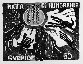 Frimärksförlaga till frimärket Världskampanjen mot hunger, utgivet 21/3 1963. Med anledning av FN-kampanjen mot hungern. Motivet är tre stycken sädesax samt stiliserade händer. Originalteckning och förslagsskisser utförda av Vera Nilsson. Valör 50 öre.