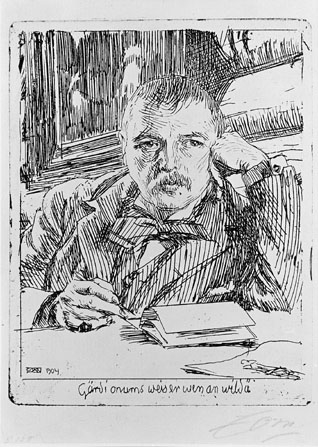 Frimärksförlaga till frimärket Anders Zorn 1960, utgivet 18/2 1960, till 100-årsminnet av Anders Zorns (1860 - 1920)födelse. Motiv: Foto av etsning (självporträtt) av Anders Zorn. (Se även neg. 11074b).