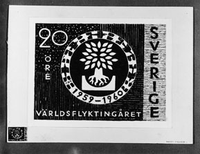 Förslagsteckningar till frimärket Världsflyktingåret, utgivet 7/4 1960. Konstnär: Randi Fischer-Gill. Teckning signerad "Randi Fischer". Valör 20 öre.