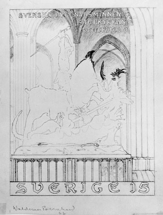 Frimärksförlaga till frimärket Byggnadsminnen, Storkyrkan i Stockholm, utgivet 24/9 1962. Del av interiör med skulpturen "S:t Göran och Draken". Skisser utförda av Waldemar Bernhard. (I Postmusei samlingar). Skiss III.