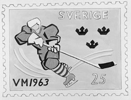 Frimärksförlaga till frimärket VM i ishockey, utgivet 15/2 1963. 1963 års VM i ishockey spelades i Stockholm.