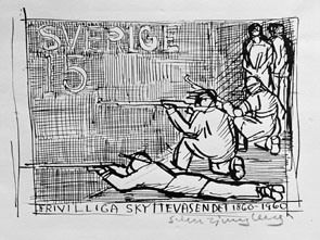 Frimärksförlaga - skiss - till frimärket Frivilliga Skytteväsendets 100-årsjubileum, utgivet 30/6 1960, av konstnär Sven Ljungberg. (I Postmusei samlingar). Valör 15 öre.