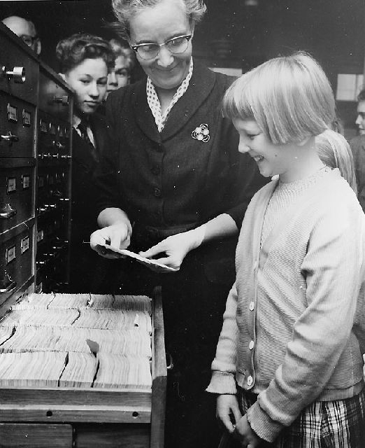 Klassen visas runt på Postspar-bankens anmälningskortregister. Här