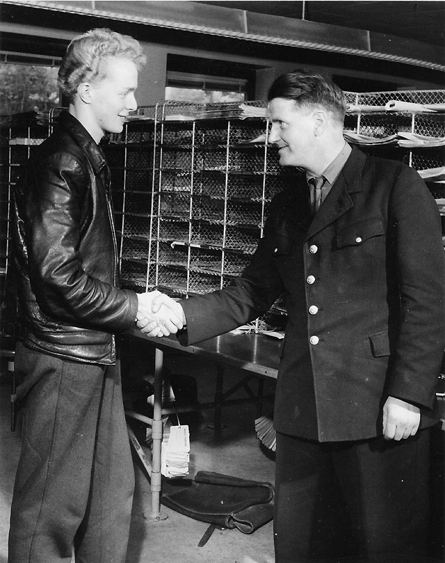 Brevbäraren-instruktören hälsar pj-eleven välkommen till