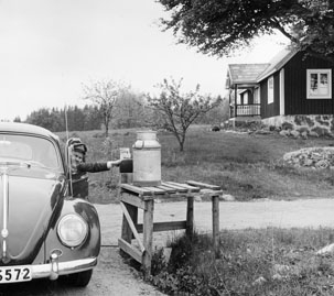Bilkåkande lantbrevbäraren Cyril Falk på linjen Lönsboda-Hunshult-Björkhult-Lönsboda. Brevlåda i Hunshult får post.