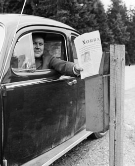 Brevlåda i Östra Flyboda får sin post. Bilkåkande lantbrevbäraren Cyril Falk på linjen Lönsboda-Hunshult-Björkhult-Lönsboda.