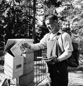 Lantbrevbärare (cyklande) Sven Eriksson, Ljusterö, under brevbäringstur mellan V:a Lagnö till Lagnö Ö (c:a 7 km).