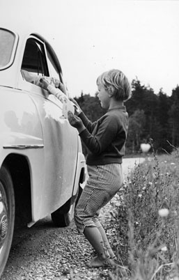Lilla Ulrika Hellström, 5 år, som semestrar i Eskelhem, får hälsningar från sina lekkamrater hemma i Stockholm av fru Astrid Friborg, bilåkande lantbrevbärare, på linjen Klintehamn - Västergarn - Klintehamn. Foton 10 - 11 augusti 1964.
