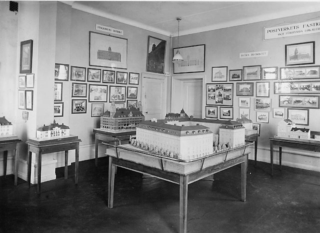Modeller av en del av postverkets fastigheter, i rum F, på 2