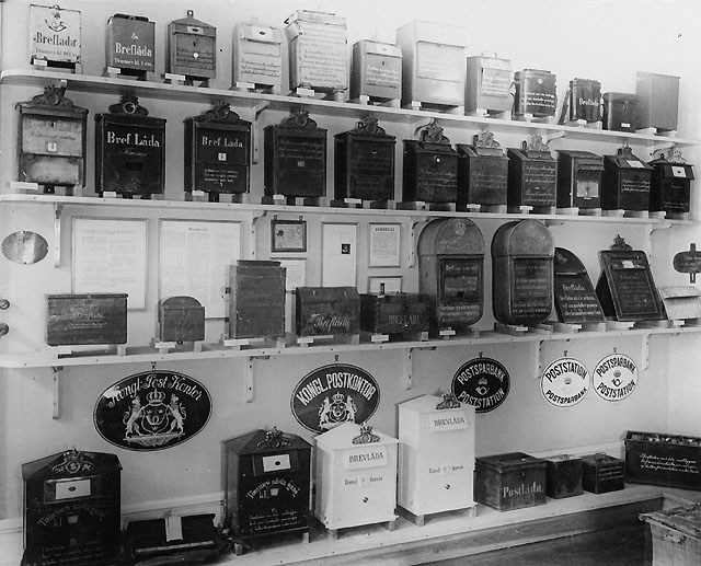 Brevlådor skyltar och kassakistor, i rum nr 18 på två trappor