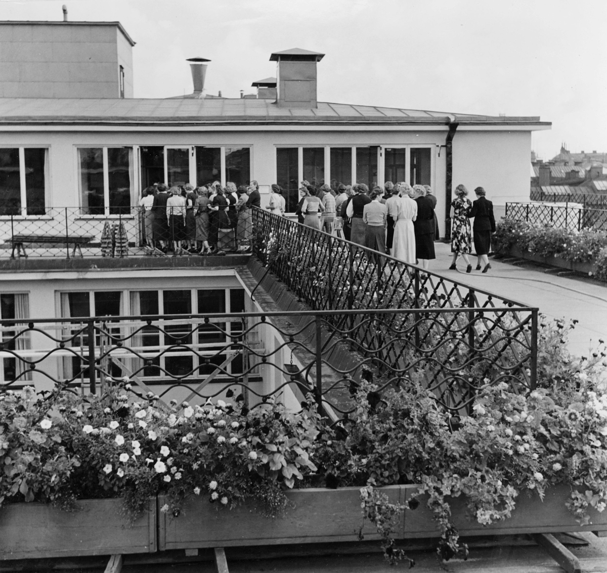 Blomsterlådor på Girohusets tak- terass. Personal på väg in till