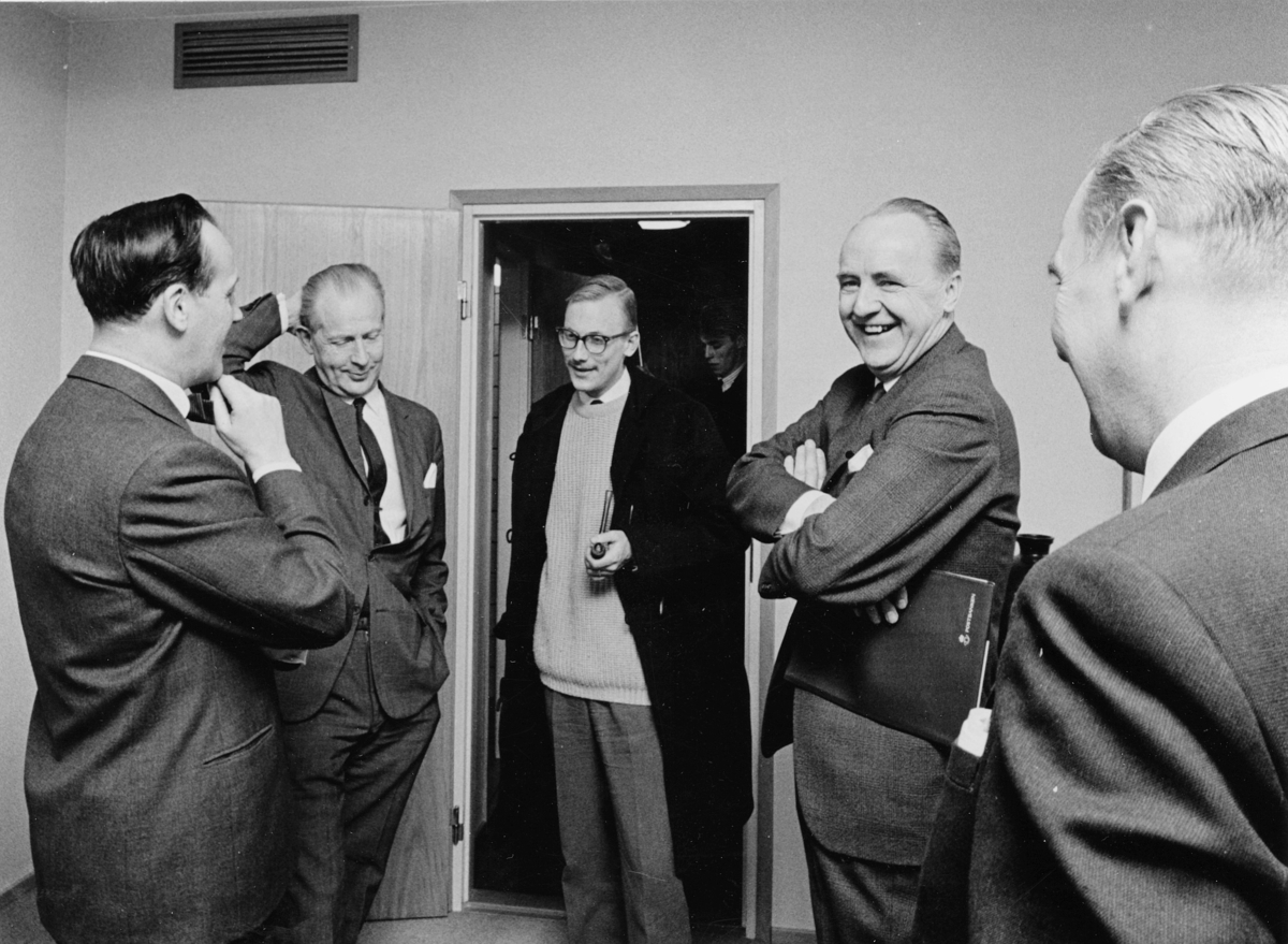 TV-aktuellts redaktör Gary Engman, i mitten, samtalar med fr.v. förste byråsekreterare Thord Hammarberg, postbankschefen Sven Lönnqvist, avdelningschef Per Åke Törnqvist och byrådirektör Harry Wicksell.