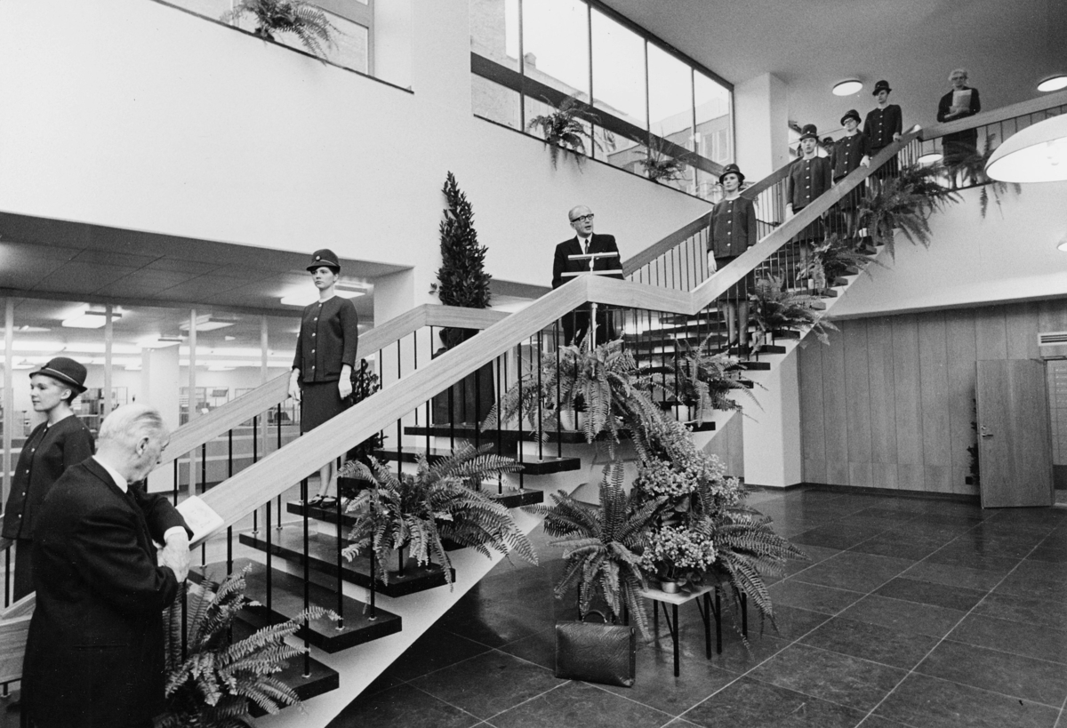 Entréhallen på nedre botten. Postbankschefen Sven Lönnqvist orienterar om den nya kontorsbyggnaden och gör några reflektioner med anledning av att 80 år förflutit sedan den svenska postsparbanken började sin verksamhet. I trappan paraderar postbankens värdinnor.