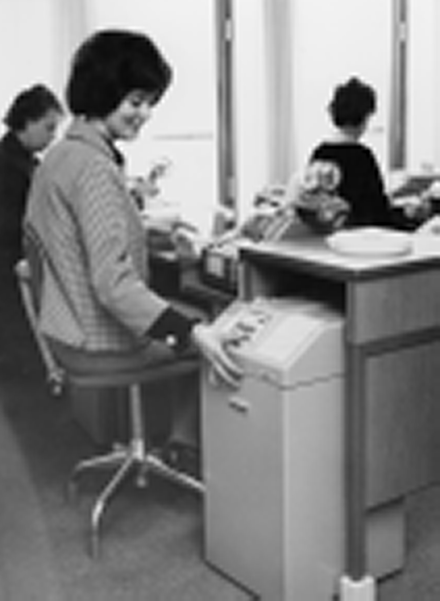 Verifikationerna går över till stansning. Här vid en av avdelningens 37 stansar sitter Ing-Marie Stridsberg. Via räknemaskinen sker stansningen på en pappersremsa i apparaten till höger.