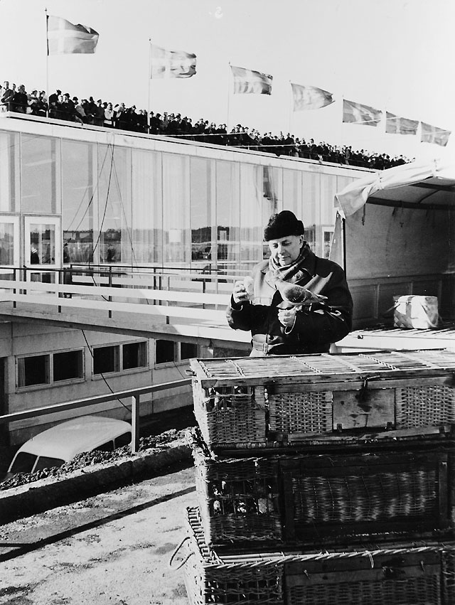 Vid burarna med 250 stycken duvor står brevduvespecialisten och