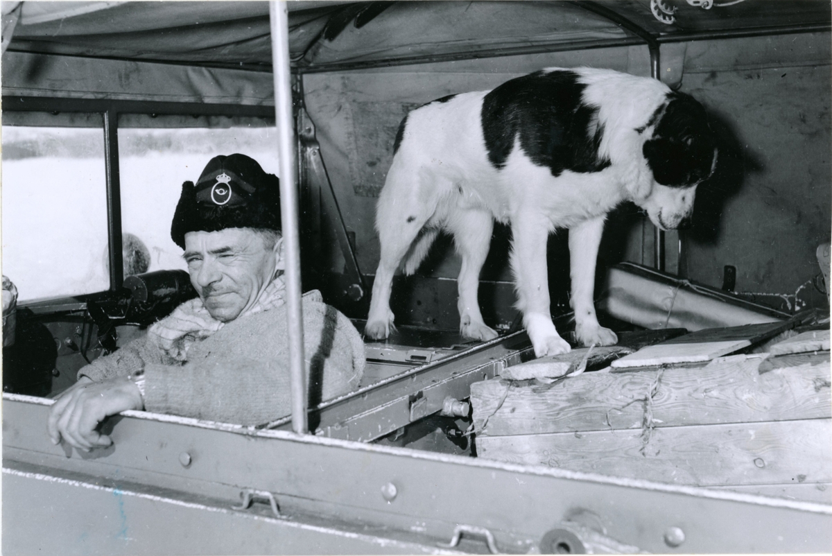 Lantbrevbärare Oskar Johansson, Vuonatjviken, körande snövessla på linjen Långudden-Vuonatjviken (33 km.) Hunden är hans trogna ressällskap. April 1952.