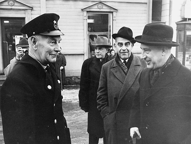 Generaldirektör Nils Hörjel t.h. i samspråk med uniformerade f.d.