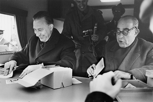 I PR-avdelningens husvagn säljer generaldirektör Nils Hörjel, t.v.,