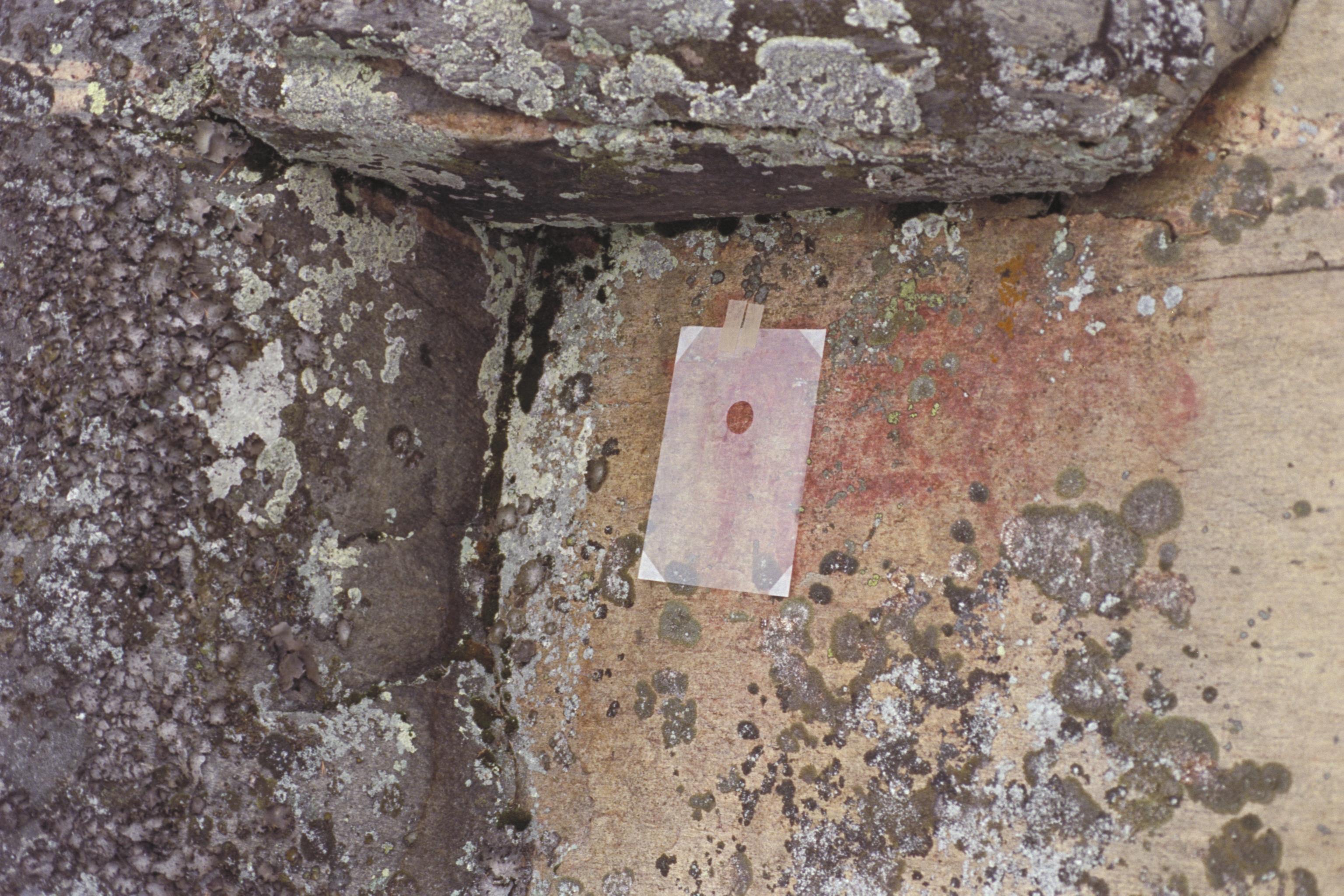 Hällmålning vid Nedre Blomsjön. Markering av mätyta för färgkamera, grupp 3