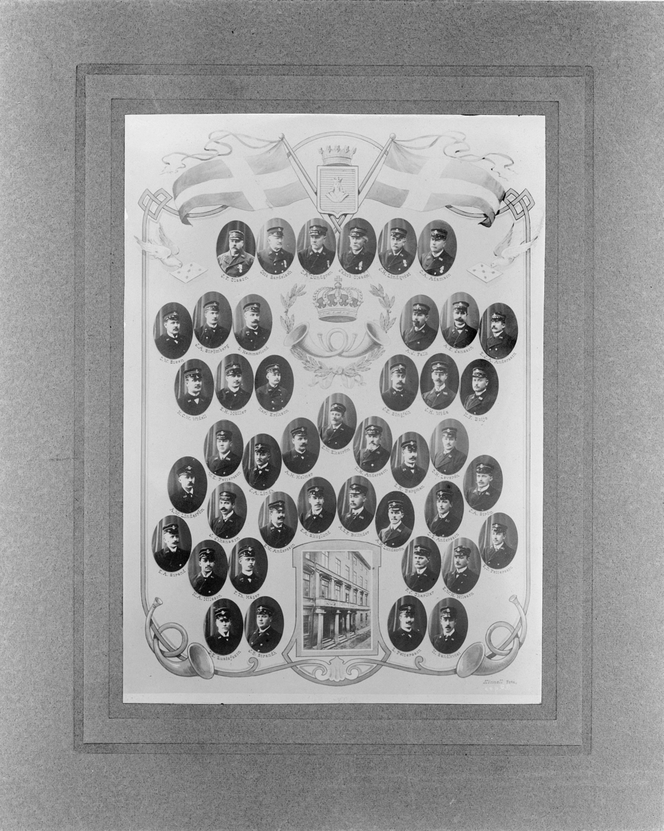 Porträttbilder av förste postvaktmästare, postvaktmästare och biträdande postvaktmästare vid postkontoret Stockholm 2, omkring år 1910.